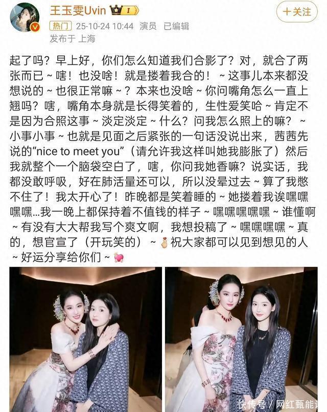 19日,女星王玉雯发文表达了自己见到偶像刘亦菲的兴奋激动和幸福陶醉,引发网友热议。 王玉雯称自己见到刘亦菲后,“我就整个一个脑袋空白了,嗐,你问我她香吗?说实话,我都没敢呼吸,好在肺活量还可以,所以没晕过去~算了我憋不住了!我太开心了!昨晚都是笑着睡的~她搂着我诶嘿嘿嘿嘿…我一晚上都保持着不值钱的样子~嘿嘿嘿嘿嘿~谁懂啊~有没有大大帮我写个爽文啊,我想投稿了~嘿嘿嘿嘿~真的,想官宣了(开玩笑的)~”